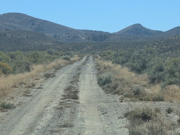 After a unremarkable night at Lahontan SP we headed out for the main event, an expedition to Icky Fish. Actually the "Berlin Ichthyosaur State Park", found as an interesting way out of the way place on a Nevada map. Why not? We left US-50 at Eastgate and headed south to Berlin, an OnX route connecting these two specks on the map. The dirt roads were pretty good with no problem getting through. A few muddy puddles reminding us it would be impassable in heavy rain. But a nice off pavement drive.