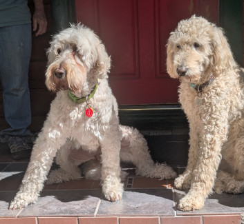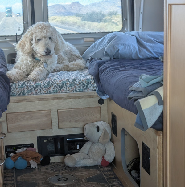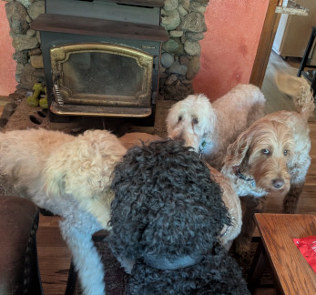 From Klamath Falls we headed south to Weed, CA. Sayonara Oregon. Here we met up with Judy, the 'doodle breeder for Cooper and Ruby. It'd been some 10 years since our last visit so we knew only a few of the dogs there. One familiar to us was Easy, a contemporary of Ruby. Very easy to get them confused having very similar presence. Ruby was drawn to Handsome who bore a striking resemblance to Cooper.